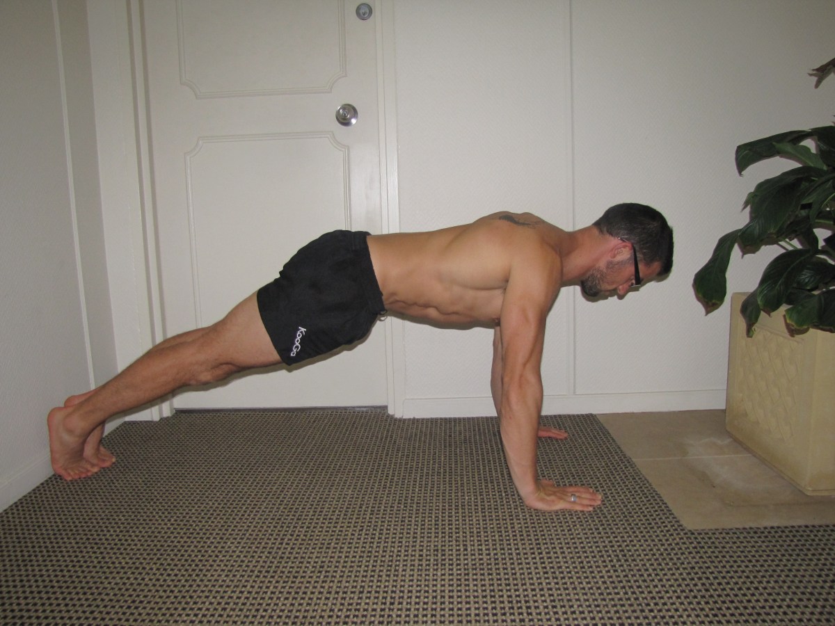 • I’ve done this hands and toes on the ground, if this is too tough then raise your hands onto a surface to incline your body and decrease the load as opposed to dropping your knees to the ground.