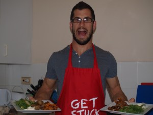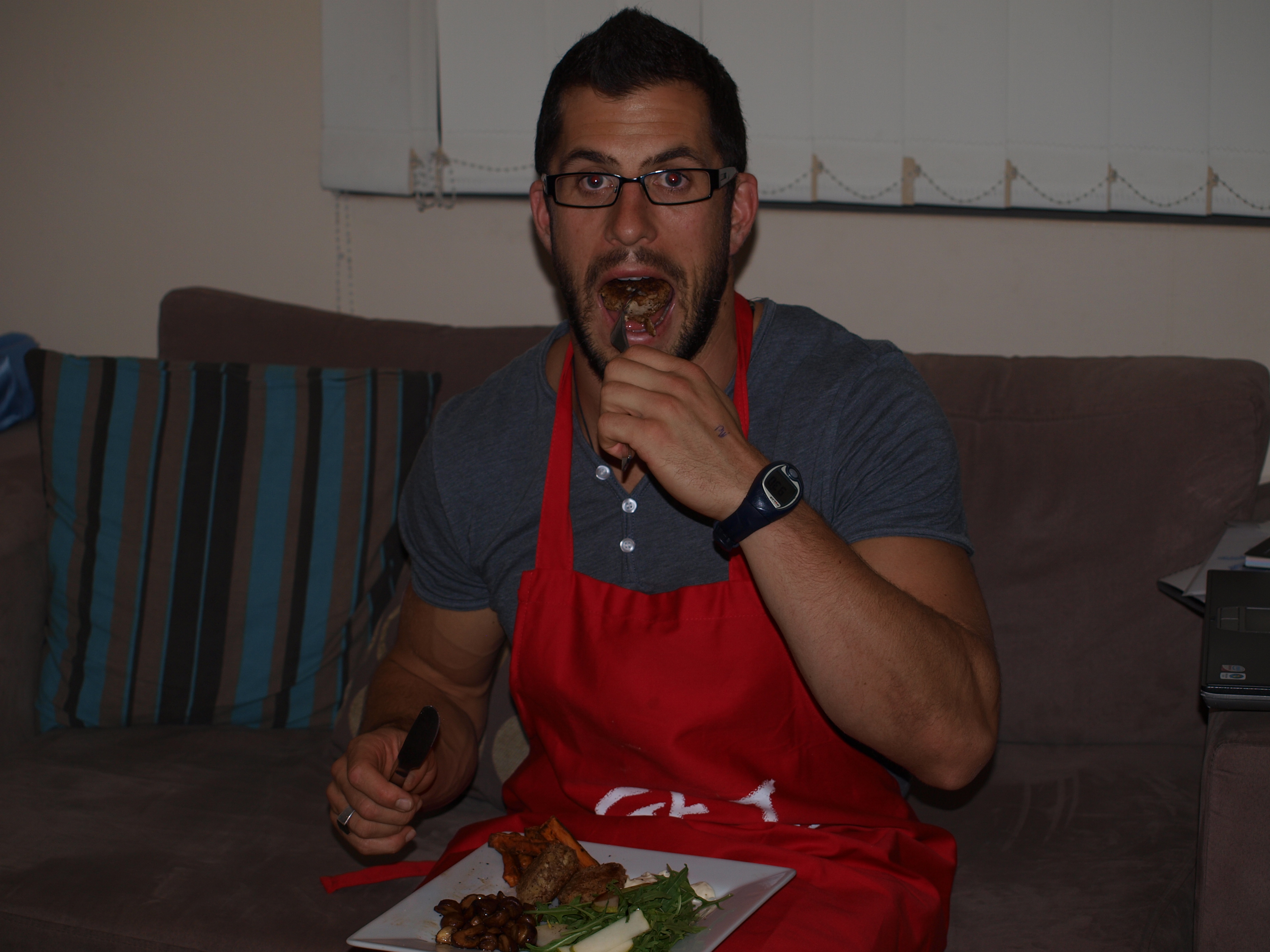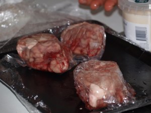 I had with me my trusty sous chef Nardia and we had also managed to talk one of my flatmates, Paul, into trying some of my meat this week. However he was informed he wasn’t allowed to know what it was he was about to throw down. Great fun ensued, screwing with him as he nervously asked questions about his future meal. At least he had the, ah… balls to go through with it, unlike flatmate number two who had seen the raw meat and quickly rejected any sign of an invite to dine.