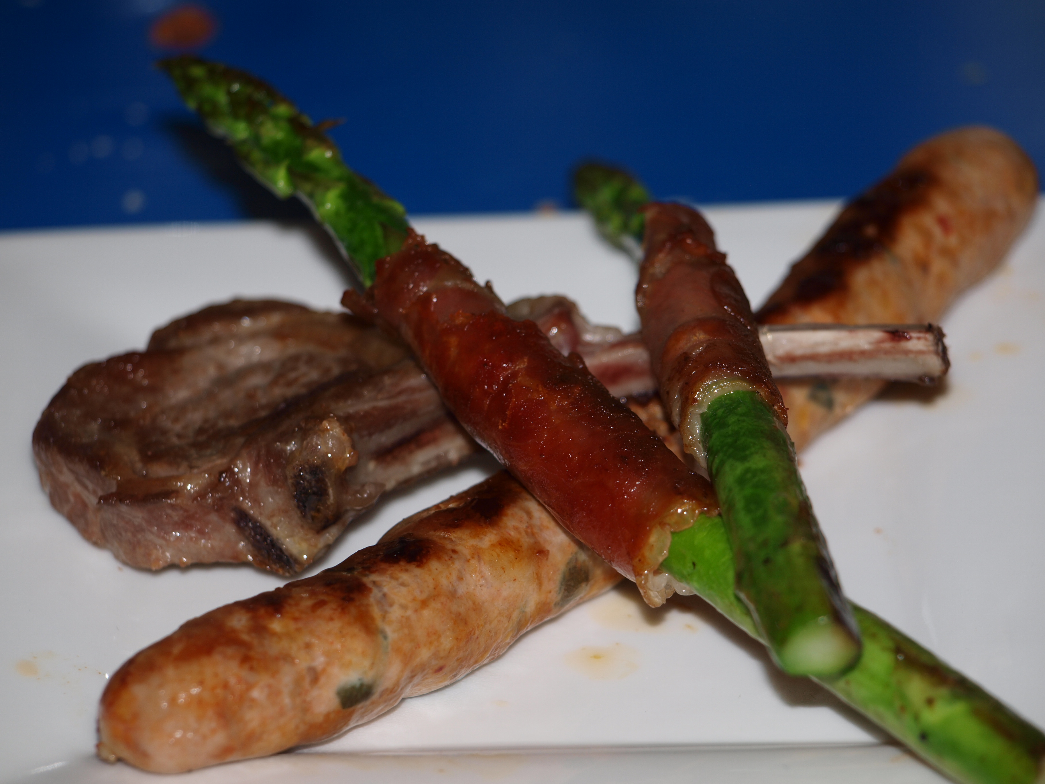So a trip to the butcher and supermarket saw me purchase a few French Lamb Cutlets, a few Spanish Lamb Merguez Sausages, as well some Prosciutto to wrap around Asparagus and some Swiss Brown Mushrooms and Sweet Potato to make some Kumara Chips.