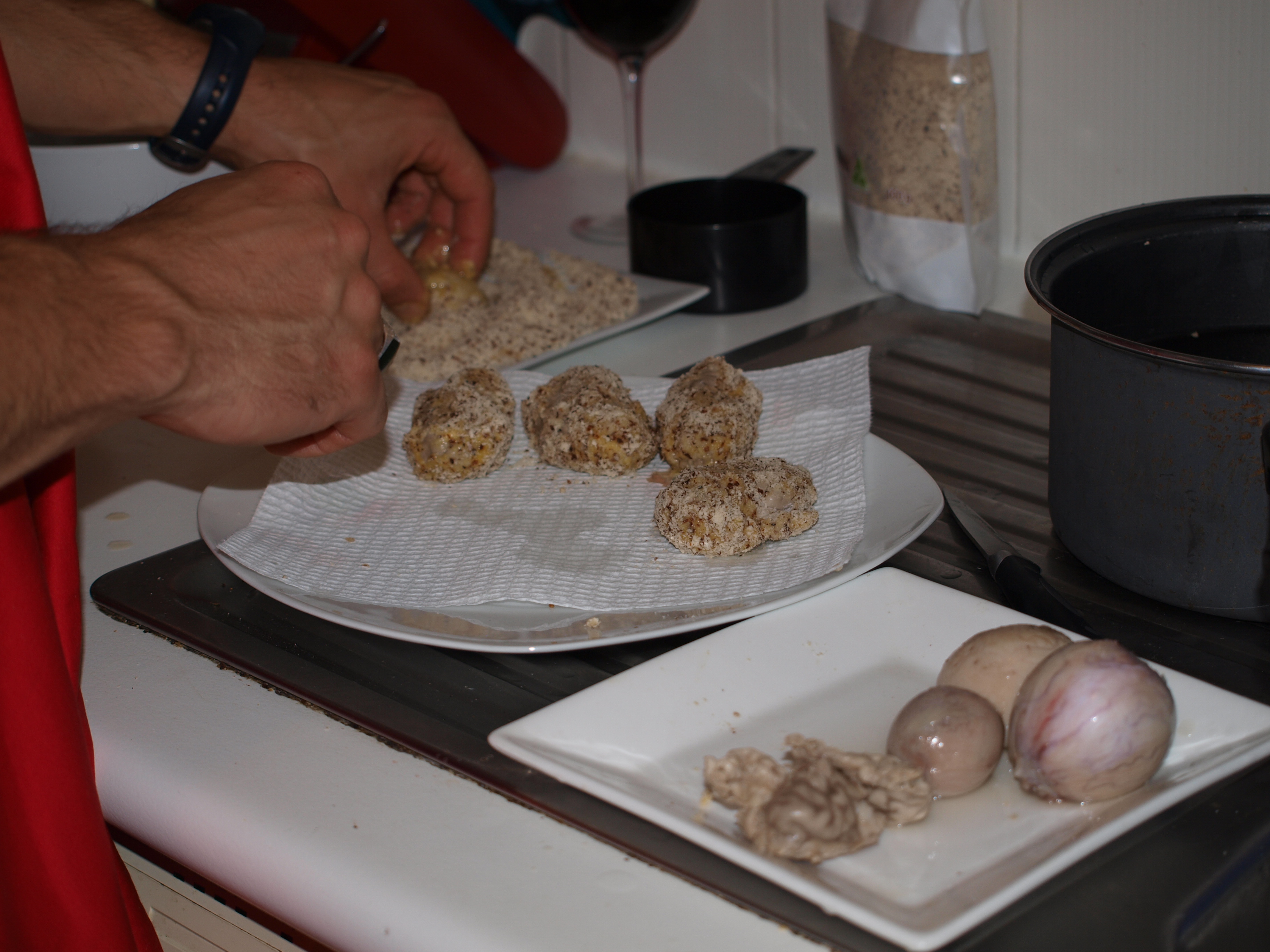 I had 6 testes and 6 brains, a lot for any man, so I only used 3 of each. I thought perhaps the whole lot might be a touch ambitious on this first attempt. However whilst contemplating this I was rolling one of the testicles in my hand and pondering the meal to come. Something very primal was occurring without my full intention.