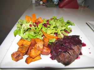 So what happened to the meat to make it so bad? It’s hard to put my finger on. This is a red meat, as you’ll see from the pictures. So I treated similar to the other coat of arms victim, the kangaroo meat. I seasoned it and seared it briefly in a hot pan then into a dish and in the oven for 20 minutes at 160°. It was at this point that I made the jus, and the salad was prepared with some brightly coloured pomegranate juice flying around and staining half of the kitchen as the seeds were removed.