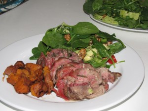 NN was in attendance and we were both pretty famished, so the jus was cut short but the thin liquid still dressed the meat. The all important tasting was soon over powered by the fresh rosemary contained within each slice. Like I said, I was good to eat a horse, so this possum stood no chance. I devoured it while making my assessment. I found the meat to be slightly tough but not really and slightly dry but also not really. It was hard to figure out, but gamey probably fits easily enough. However, I liked it. The other flavours were nice, but some mouthfuls were dominated by the rosemary, which I can imagine bunches easily in some parts as it is all rolled up. NN isn’t a huge fan of rosemary and so was mostly overwhelmed by the flavour. I think she got more than me, as I knew what she meant, but mine was limited.