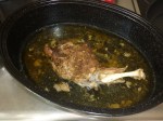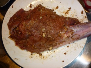 Over a nice glass of NZ Shiraz on Friday night I got one of the hind legs ready by rubbing it with olive oil, salt, pepper, paprika and fresh garlic. This then sat in the fridge over night and I put into the oven after breakfast at 130°C with a small amount of water and white wine, covered and cooked for close to 3 and a half hours.
