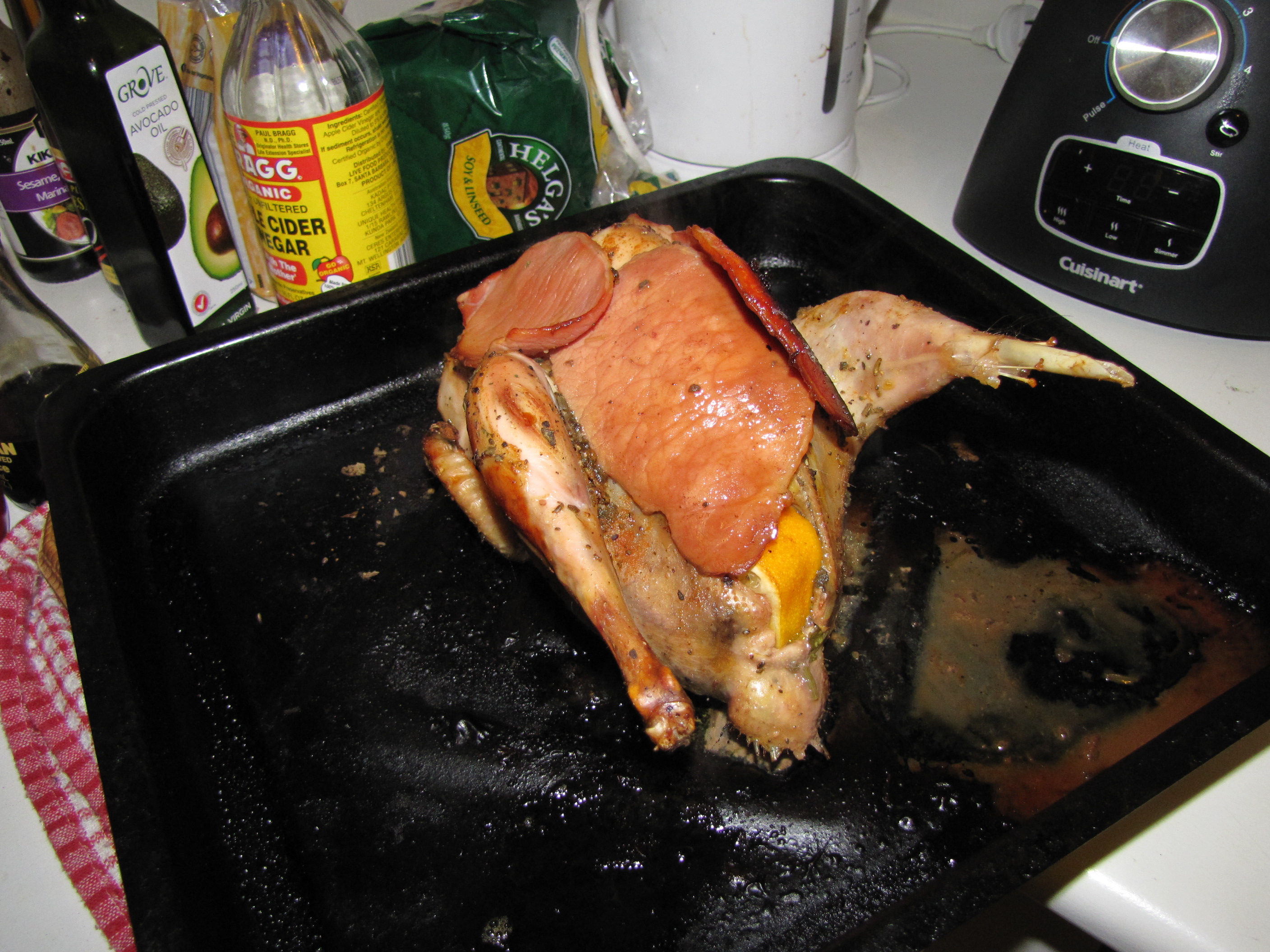 That sounds quite simple, but let me assure you it wasn’t. First off I had forgotten to buy the bacon. I decided to flag it. Then the same for the parsley. And ditto. Then upon realising I out was of foil to cover the dish I spewed a few expletives and stormed out into the cold night to the supermarket. Eventually I was back in my toasty flat, the bird with bacon covered breasts was in the oven and the smells were wafting.