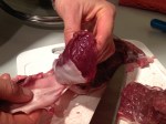 I arrived into Auckland on Friday night and was presented with a large amount of semi frozen Thar meat. One entire back strap (think whole eye fillet of beef or lamb back strap- the most tender part of the animal) and one leg roast. The back strap still had quite a bit of skin, sinew and hair on it, so I got working on making it TV ready. I put my best and limited butchering skills to the test.