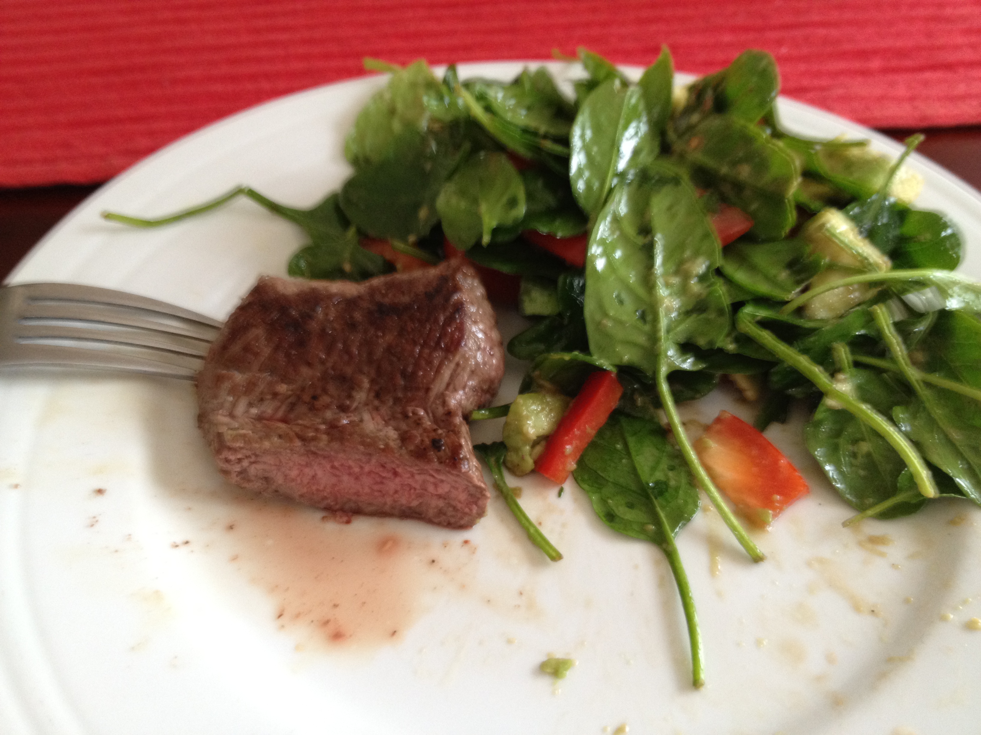 Once my amazing support crew-the one woman preparation and support machine NN- and myself had enjoyed some post TV relaxation and my nerves chilled out somewhat, we later fried the butterflied back strap pieces for lunch with a simple salad. A hot pan, some seasoning, quick frying, time to rest, some more seasoning and this is some of THE TASTIEST MEAT I HAVE EVER HAD. No exaggeration, no lie- if you ever have the chance to eat this cut of Thar- do so without any hesitation! Sell your first born if need be…
