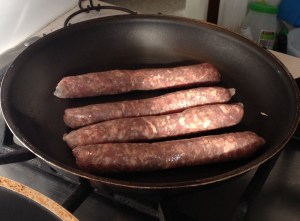 I fried the aromatic sausages slowly then let them finish off in the oven while we got the mushrooms and spinach going on one pan and the water boiling for the eggs on another element.