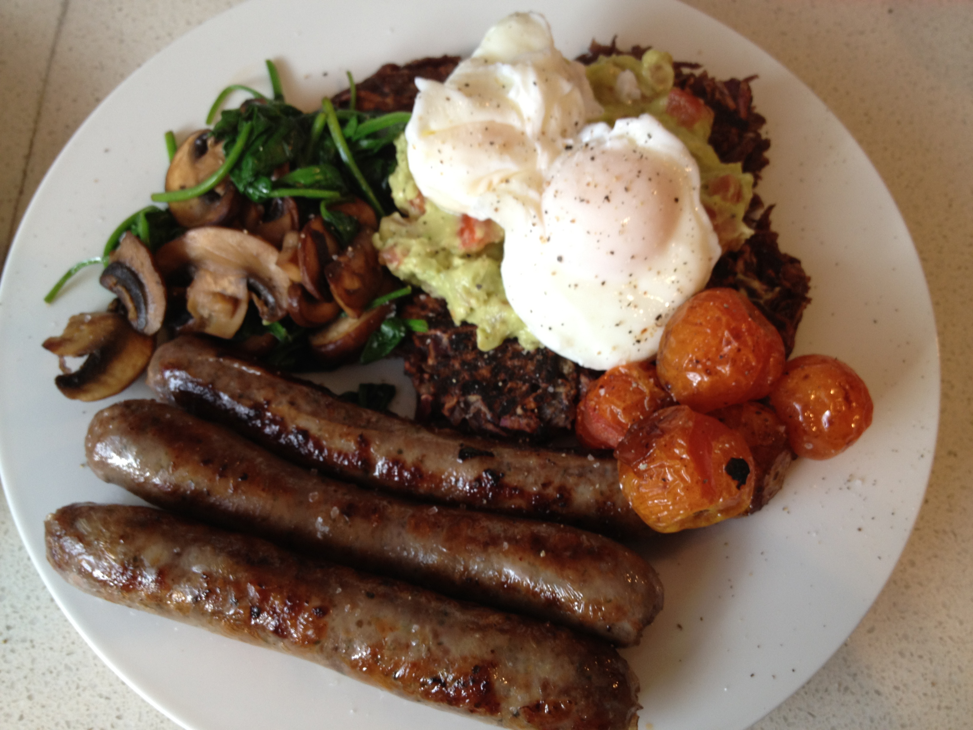 The rosti was a nice and easy change to starchy potato, however, the guacamole topping with perfectly poached eggs on top made this something that will now be forever in my breaky fry up arsenal. YUM! The cherry tomatoes were scrumptious while the mushroom-spinach combo was the perfect final touch. I loved this breakfast!