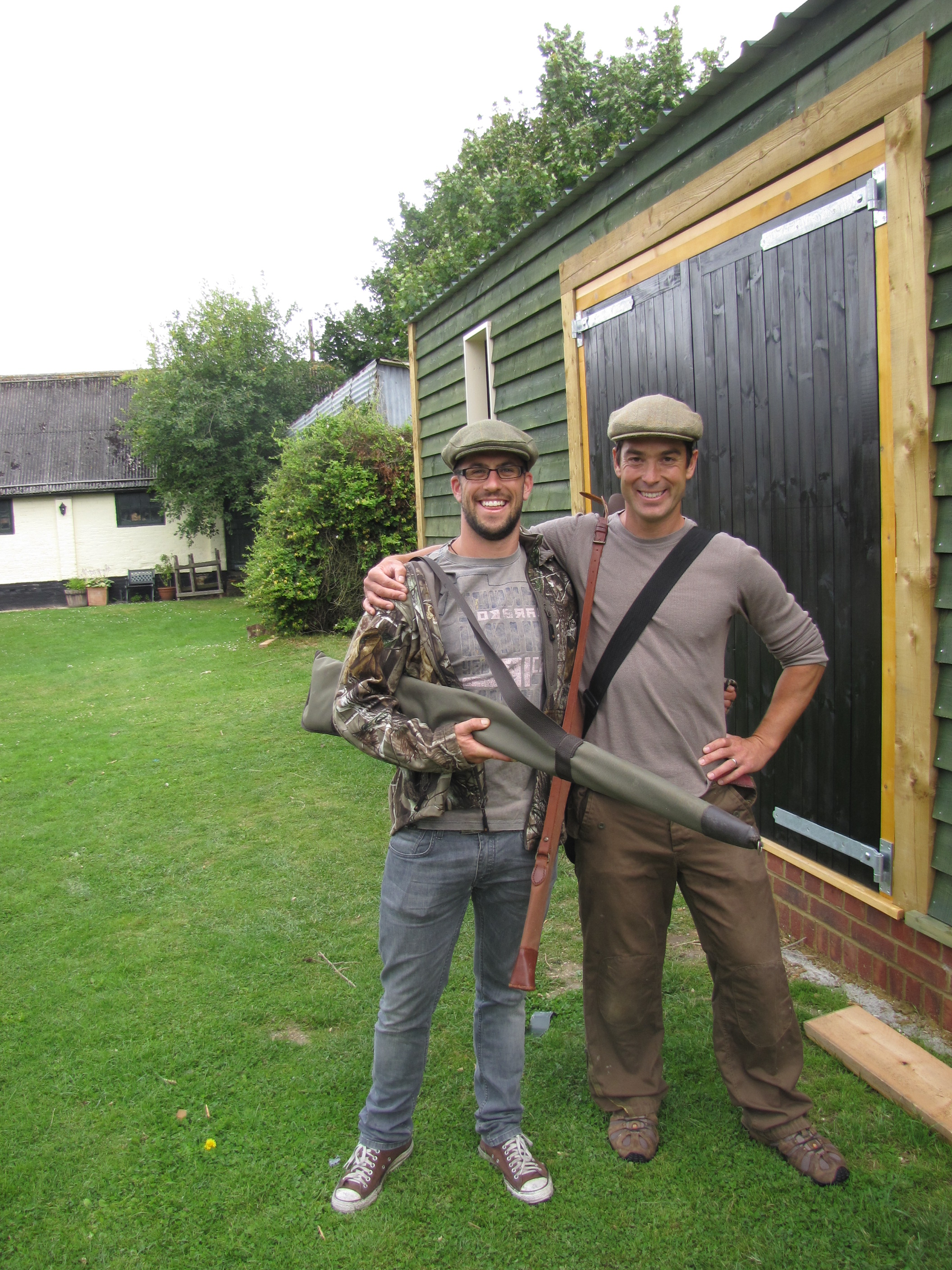 Once there I met up with Simon and his gorgeous two year old twins. We navigated back to his place in the country, checked out his under construction barn gym, and got to getting all things hunting sorted- guns, camo, bullets, hats, decoy pigeons, upper class English accents…