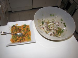 Luckily I came home full of enthusiasm and unfounded confidence. As well as 3 lists full of ingredients. One to marinate the baby octopus, one for the salad and one for a salsa/dressing.