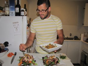 Once NN arrived I fired up the pan, got it hot, dried off the octopuses and dumped them into cook ever so quickly, as I had been warned numerous times already. They curled and twisted and generally looked like they’d rather be back at sea than in the pan. Well too bad really, as they soon made it to the top of the mixed leaf, coriander and paw paw salad, to then be dressed with the paw paw and chilli salsa.
