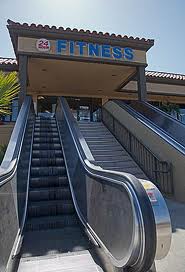 People standing on an escalator going up to the entrance to a gym or fitness centre?