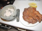 I made a simple marinade of ground cloves, nutmeg, cinnamon and rock salt. I grated in some lemon zest and the squeezed in the juice to form a paste. Once mixed I added the meat and this rested for a couple of hours (while I had beers. Did I mention that?).