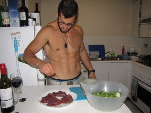 So, I decided on a quick and easy meal consisting of: Tasmanian grass-fed wallaby fillet and garlic mushrooms, with duck fat roasted golden sweet potato and simple salad of rocket, pear, parmesan and roasted mixed nuts. Even Mr Bean could nail this.