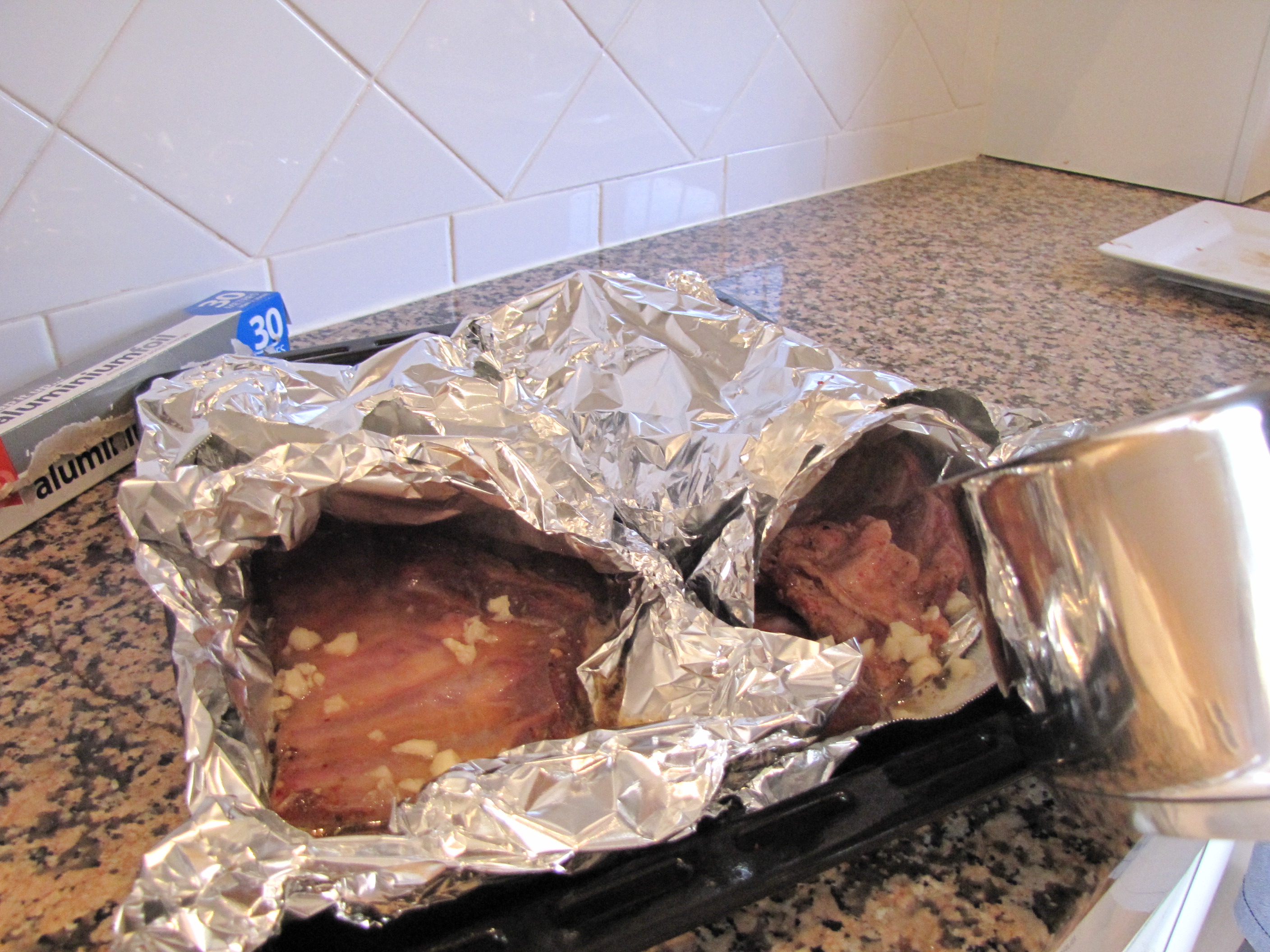 When the time came the following day to finish the job I was initially quite perplexed by the rest of the recipe, purely because whoever had written it was clearly drunk on ribs and it was what I would call incomplete. But with NN’s help I managed to fill the gaps and get the ribs into some little foil parcels filled with the now made sauce mix and into the oven to slowly and gently cook for 2 hours.