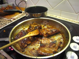 Next came taking the ribs from their parcels and pouring the sauce into a pot to reduce down to a glaze. This was harder than expected as nothing happened apart from the volume of liquid reducing. No viscosity entered the picture as planned so I ended up pouring some over the first lot of ribs, which I had now separated into more manageable portions and adding to the hot pan. They burnt a little and smoke engulfed the kitchen lounge and ah, the suburb. I removed these, put the rest on the pan and just poured the sauce over them in there. Voila! All of a sudden the sauce became sticky very quickly and the ribs were soon covered in a thick glaze, so it was out with them and back in with the others.