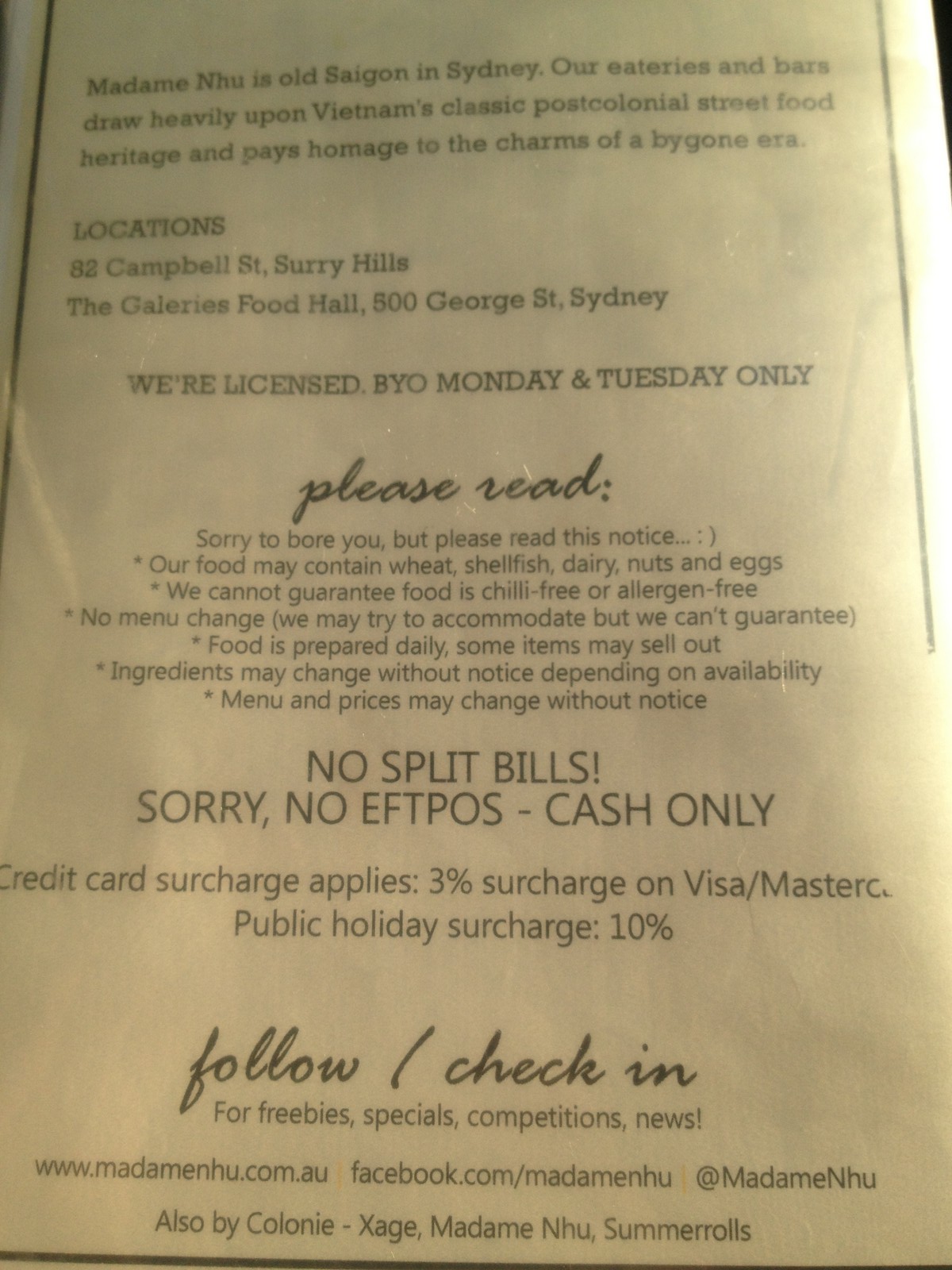 We ordered some great sounding dishes, with the hope of great ingredients. These were the Roasted duck summer rolls with hoisin sauce, the Signature đặc biệt phở with beef prepared three ways and Steamed Hải Nam chicken with chilli ginger soy sauce. I was keen to ask a few questions about the food and if things could be requested etc, until I saw this on the back of the menu: