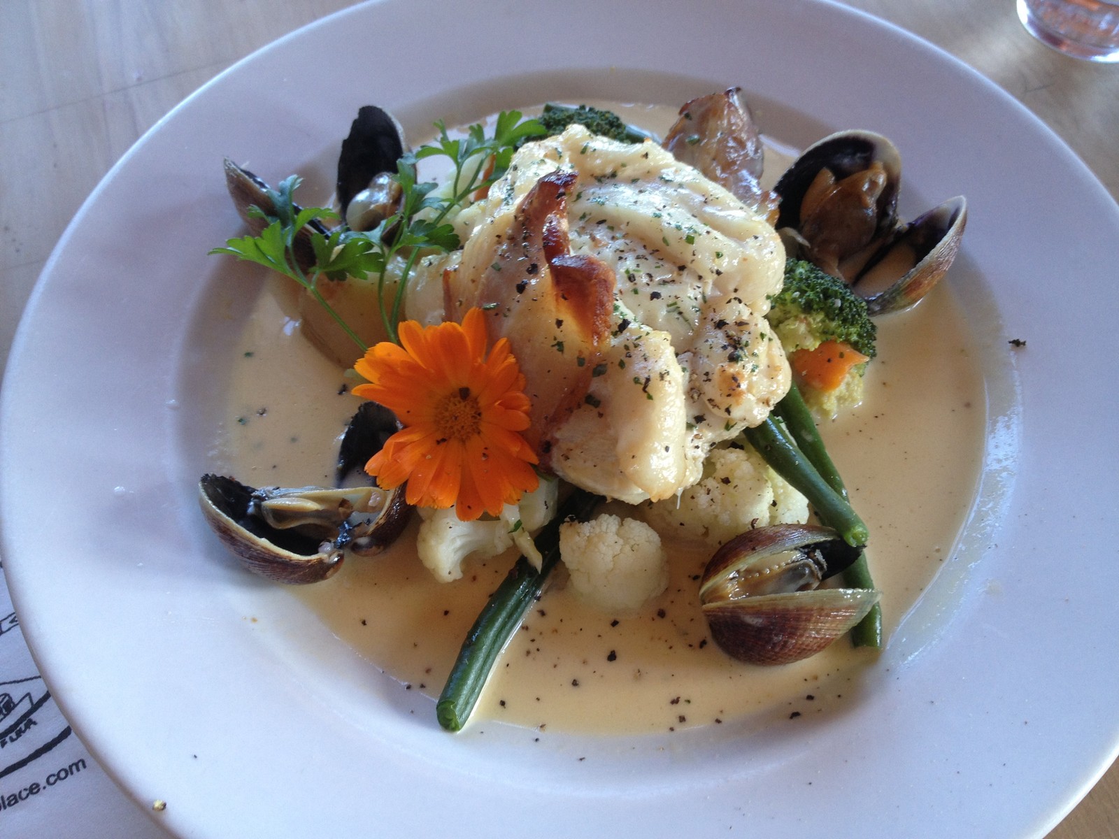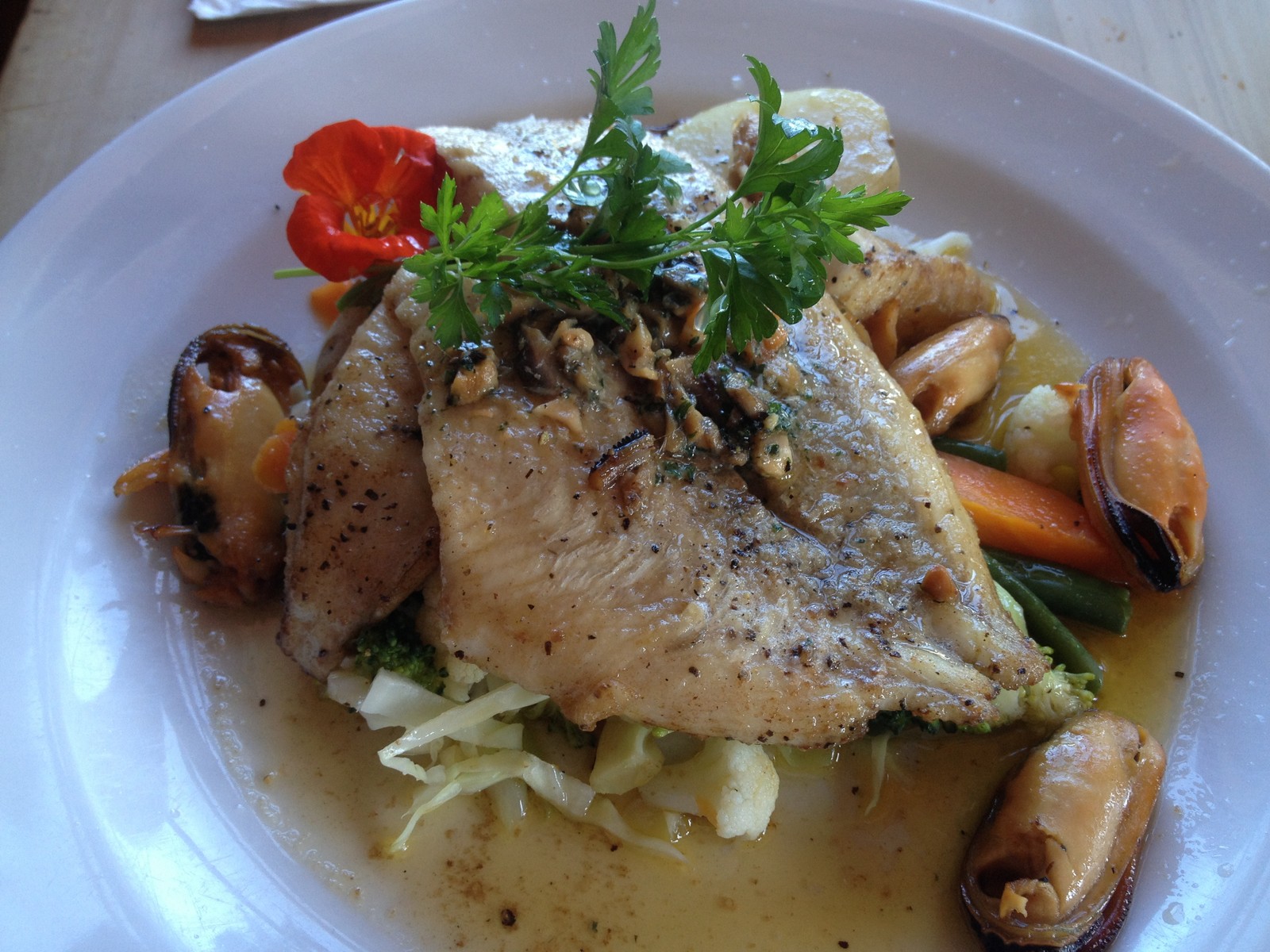 For the main I ordered the Pan-fried Moki in anchovy butter with Smoked Mussels, and the men ordered Smoked Bacon wrapped Blue Cod with Cockles in White wine Sauce…(by the way I am salivating at the memory of this dish).