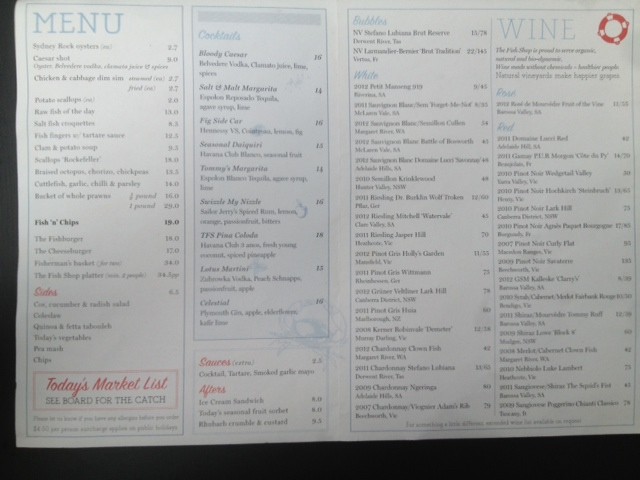 The Fish shop is a cosy little beach themed restaurant, which is owned by the Merivale group (Sydney based peeps think Ivy, Est, Establishment, Felix etc…). What this means is that the food is going to be pretty good. (As an aside, many of the restaurants that make up the Merivale group are fortunate to have well experienced chefs, who continuously come up with exciting menus and great drink selections – as you may guess I am a fan!)