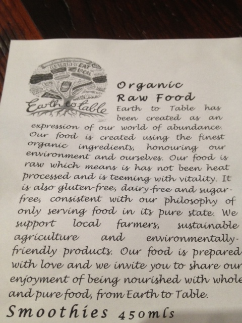 Whilst we do eat a fair amount of raw food (in the form of salads and raw veggies and nuts etc), I was interested to have a whole meal. This lead us to the café Earth to Table in Bondi for a Sunday breakfast date.