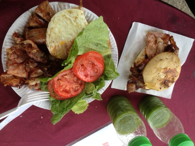 Trying to eat with our quinoa bowl in one hand, juice in the other and juggling a runny egg sandwich requires skill and effort – but I guess that’s part of the parcel of eating at the markets.