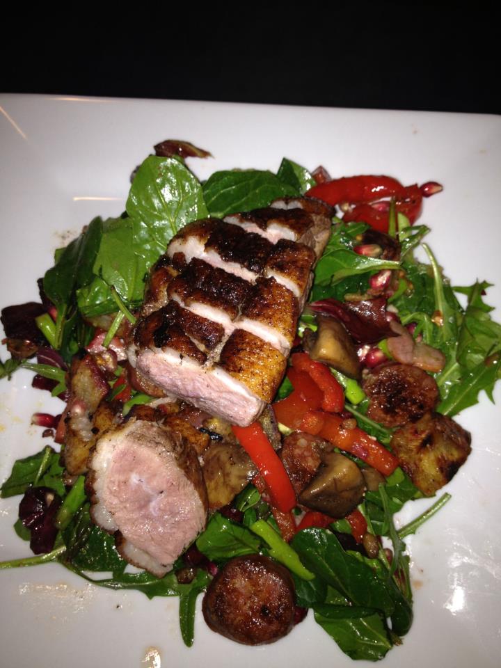 12. Lay salad onto plate and sit sliced duck breast on top.