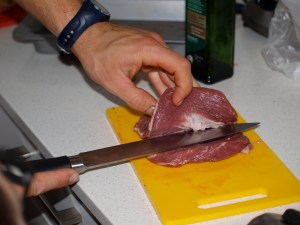 First slice the meat through the middle, making a pocket horizontally.