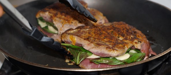 Then stuff the meat with fresh basil leaves and gruyere cheese.